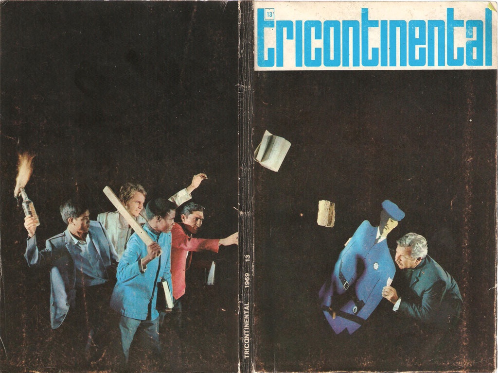 Synthèse allégorique de l’internationalisme du tiers monde : la jeunesse (masculine) d’Asie, d’Afrique, d’Amérique latine et d’Europe/États-Unis combat l’impérialisme, qui se réfugie derrière un mannequin de police, avec des armes et des livres.